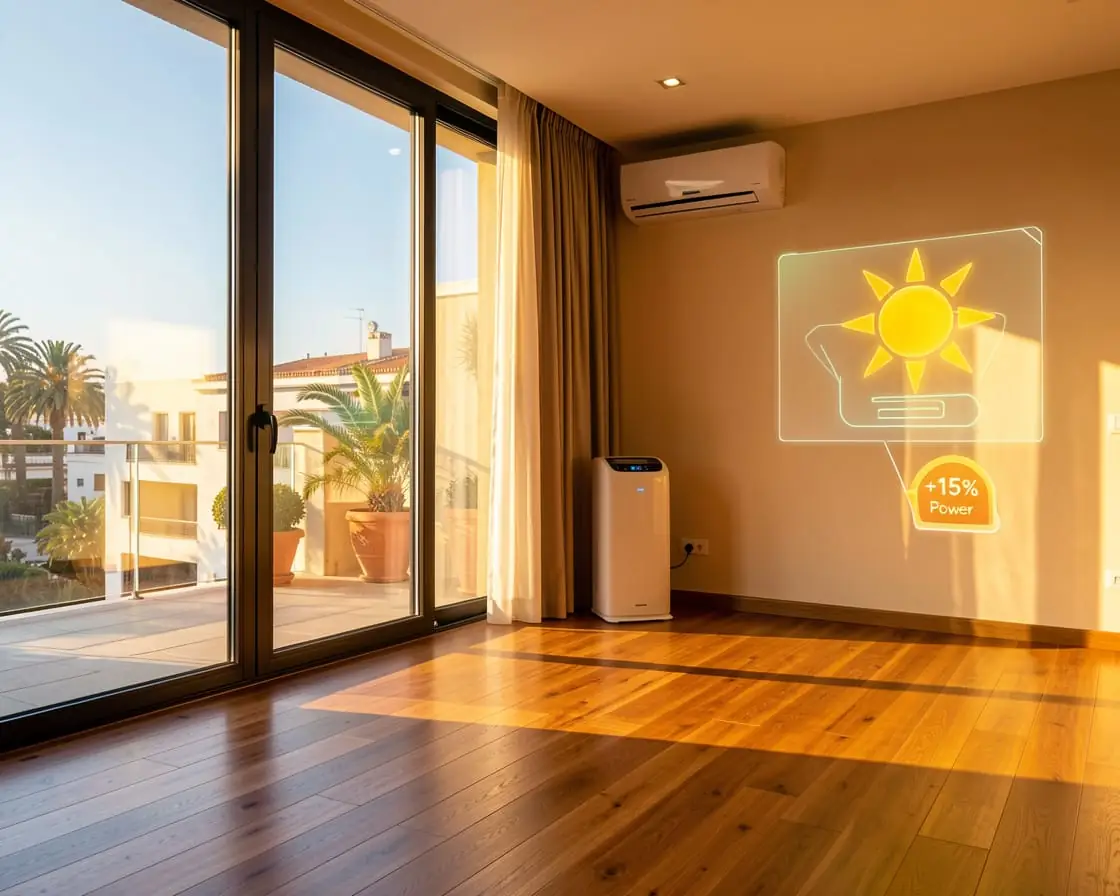 Si tu salón tiene grandes ventanales donde da el sol de tarde (típico en Valencia), el calor acumulado es mucho mayor.