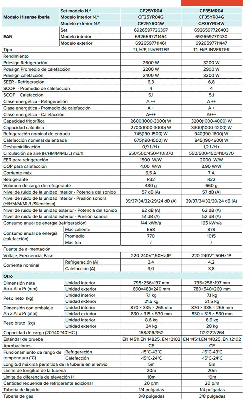 Aire Acondicionado Hisense Serie Style CF35MR04 con gas R32, etiqueta energética A++/A+, potencia de 3,2 Kw en frío equivalente a 2752 y 3,3 Kw en calor equivalente a 2838 frigorías (Kcal/h) y Diseño elegante y extra-compacto, recomendado para estancias de hasta 30 m2. Ultra silencioso (21dB). Incluye mando a distancia con pantalla LED. Control wifi incluido de serie.